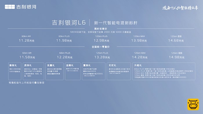 吉利银河L6,推出60km纯电续航AIR版型、PLUS版型和125km纯电续航PLUS版型、MAX版型及星舰版型共五款车型,全国统一零售价为11.58~14.98万元,还将享受七重购车好礼。
