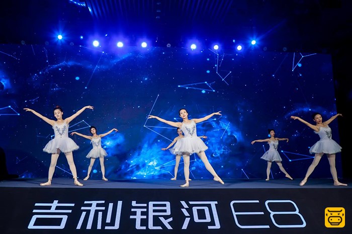 吉利银河E8是首款基于SEA架构打造的纯电轿车,应用全球首个量产一体式发光前脸、全球首发45英寸8K无界智慧霸屏,搭载全新一代高通骁龙8295旗舰座舱芯片,集当前最新科技于一体,是吉利科技造车的集大成之作。伴随着优美的双人舞蹈,品鉴活动正式拉开帷幕。
